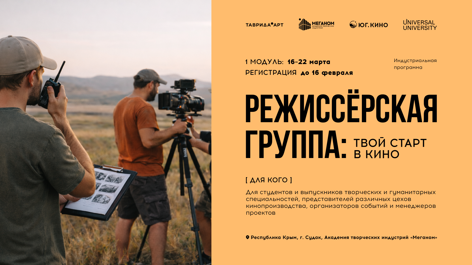 На базе Академии состоится образовательная программа «Режиссерская группа: твой старт в кино» (далее – Программа), которая направлена на подготовку специалистов второго эшелона киносъемочных профессий: помощников режиссера, бригадиров, актеров массовых сцен и ассистентов режиссера по актерам.